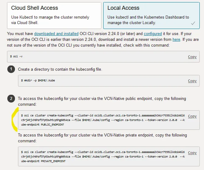 - Select Local Access and follow the steps, making sure you run the command for using the public endpoint