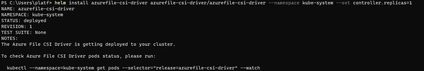 helm install azurefile-csi-driver azurefile-csi-driver/azurefile-csi-driver --namespace kube-system --set controller.replicas=1