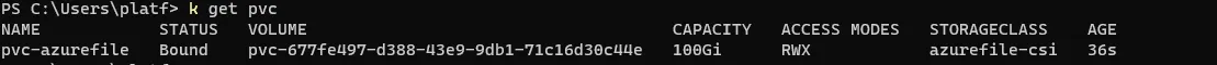 This will use the pvc-azurefile PVC and mount the storage at /mnt/azurefile